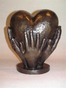 Het hart (as reservoir) wordt gedragen en omsloten door handen van ouders en broertje. De handen zijn kopieën van de echte handen.